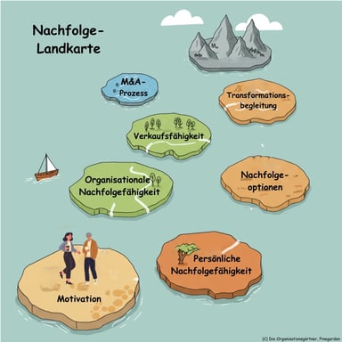 Nachfolgemanagement ist mindestens eine Triade aus klassischen M&A-Prozessen, Coaching und Organisationsentwicklung. Als ich mich mit Ivo Kuhnt von Pinegarden dazu ausgetauscht habe, ist unsere Idee der Nachfolgelandkarte (Succession Map) entstanden, auf der sieben Inseln zu bereisen sind und die Orientierung auf dem Weg der Nachfolge bietet. Die Route hat einerseits eine gewisse Grundabfolge und ist gleichzeitig von iterativen Reiseschritten oder auch dem Aufenthalt auf mehreren Inseln gleichzeitig geprägt.